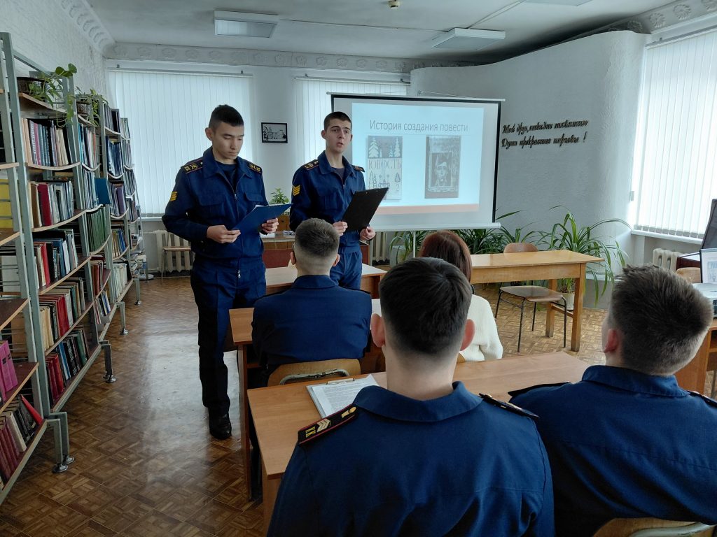 Литературная гостиная «Герои на все времена» собрала в читальном зале библиотеки одиннадцатиклассников. Мероприятие посвятили повести Бориса Васильева «В списках не значился». Заведующая библиотекой Галина Петровна Бычкова рассказала кадетам о биографии писателя, а ребята подготовили презентацию о самой повести и ее героях, показали одноклассникам фрагменты из одноименного фильма и прочитали трогающие душу читателя отрывки из произведения.