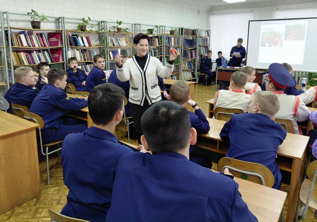 В гастрономическое путешествие «Вкусная этимология» пригласила девятиклассников Ольга Геннадиевна Дворникова. Старт познавательному мероприятию о значении и происхождении слов, связанных с продуктами питания, дал рассказ Бориса Екимова «Каймак». Кадеты-ведущие в казачьем облачении рассказывали ребятам о значении и происхождении таких слов, как творог, помидор, каймак, сметана, огурец, хлеб, баранки, пряник и перец и др. Зрители активно участвовали в мероприятии, после чего отвечали на вопросы на закрепление полученных знаний, а за правильные ответы кадеты получали пряники и баранки.
