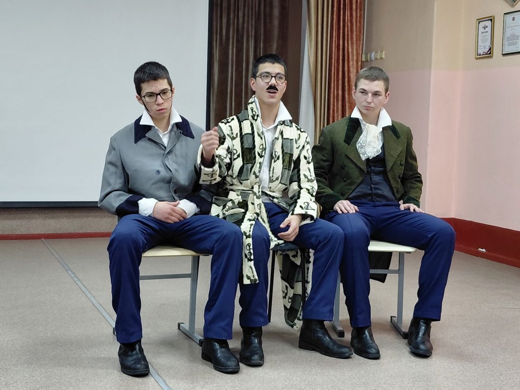На открытии предметной недели одиннадцатиклассники в стихотворной форме рассказали своим младшим товарищам о важности грамотного владения русским языком и чтения произведений великих мастеров слова. Затем учителя объявили всем ребятам о старте первого мероприятия – «Приглашаем в кадетский театр. Играем Гоголя».