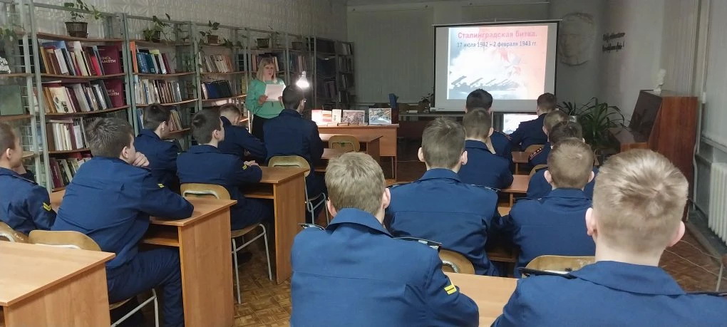 Татьяна Анатольевна показала ребятам отрывки из фильма Федора Бондарчука «Сталинград», фильма «Горячий снег» по одноименному роману Юрия Бондарева, «Возмездие», снятого по роману Константина Симонова «Солдатами не рождаются». Кадеты послушали фрагменты из песен о Сталинграде.