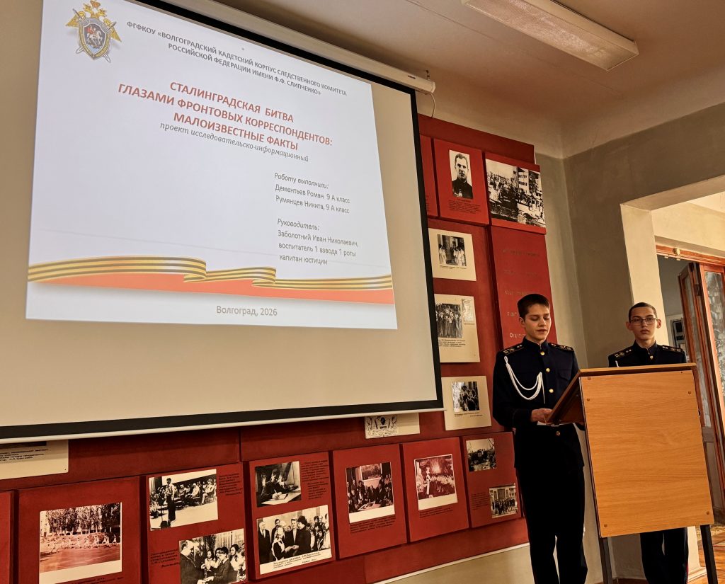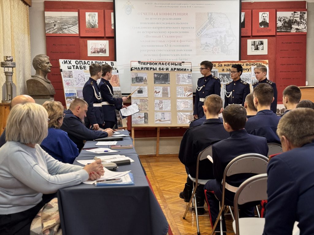 В Волгоградском кадетском корпусе Следственного комитета Российской Федерации имени Ф.Ф. Слипченко подведены итоги ежегодной отчетной общекадетской конференции по итогам реализации индивидуальных и коллективных проектов в рамках поисково-исследовательского гражданско-патриотического проекта по историческому краеведению «Военный Сталинград: малоизвестные герои и факты» в формате гражданско-патриотического форума «Сталинград – пароль Победы», посвященного 83-й годовщине разгрома немецко-фашистских войск под Сталинградом.