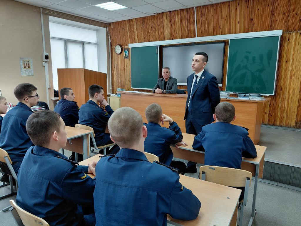 Александр Валерьевич рассказал кадетам-восьмиклассникам о том, как чувство долга перед Родиной, а также примеры боевого пути его предков послужили причиной оставить на время свою семью и гражданскую профессию, подписать контракт и добровольно отправиться в зону СВО.