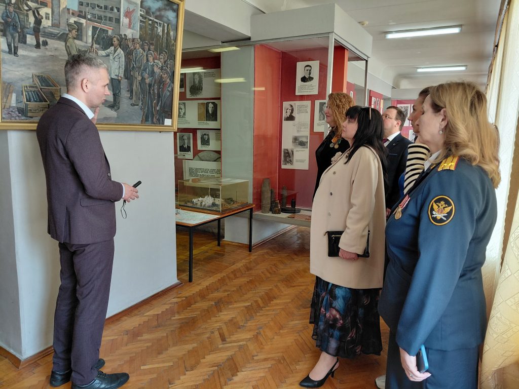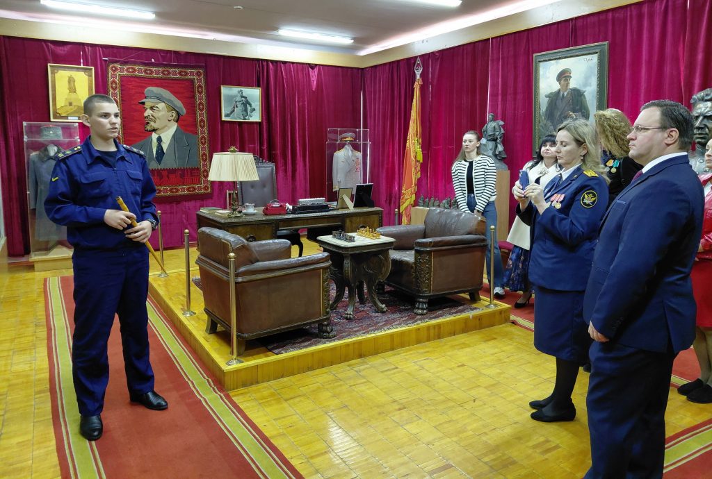 Для гостей кадетского корпуса первый заместитель директора Леонид Андреевич Комлев, заведующий музеем Артем Сергеевич Кочергин и сами кадеты провели экскурсию по территории общеобразовательной организации и уникальным экспозициям залов Народного музея боевой и трудовой славы тракторозаводцев.