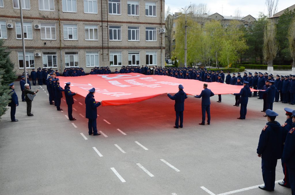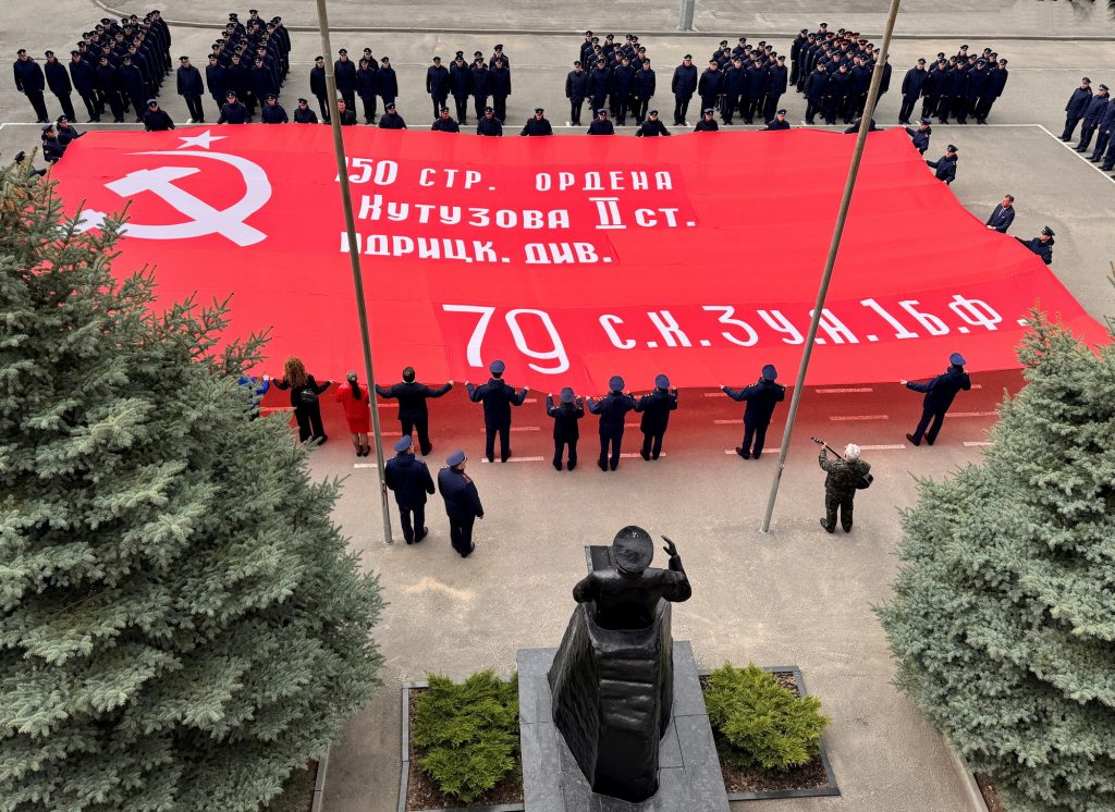 На торжественном построении в кадетском корпусе гости и обучающие развернули копию Знамени Победы размером 20х10 метров.