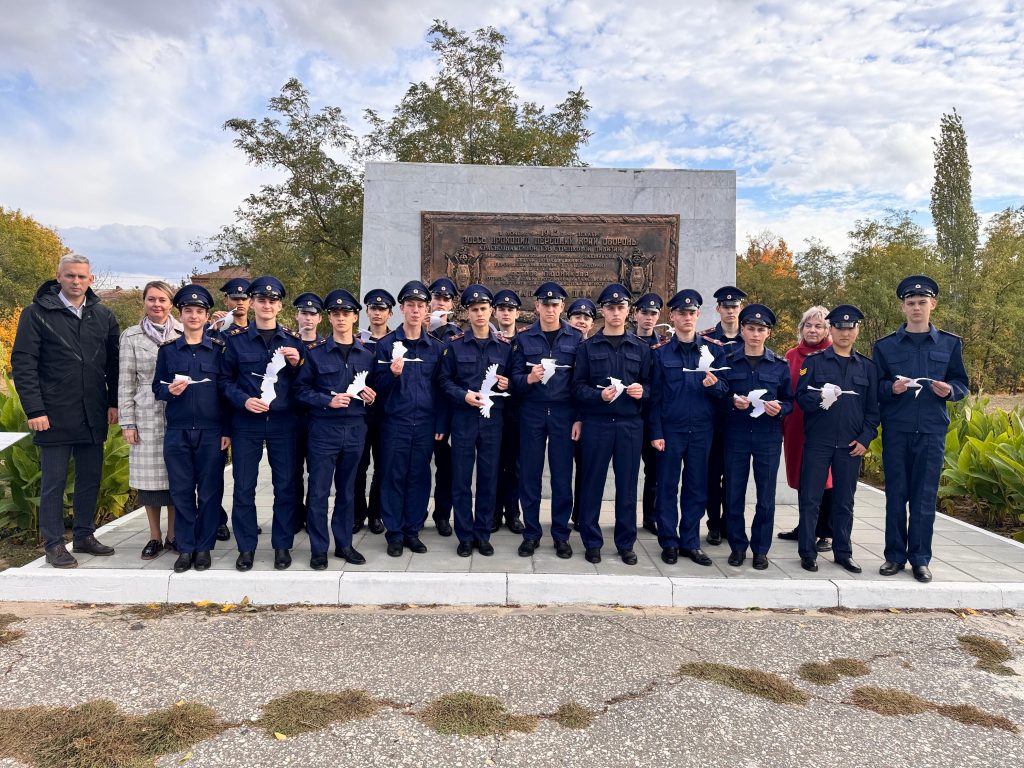 Представители кадетского корпуса почтили минутой молчания память советских воинов, погибших в период Сталинградской битвы и возложили белых бумажных журавлей у братской могилы.