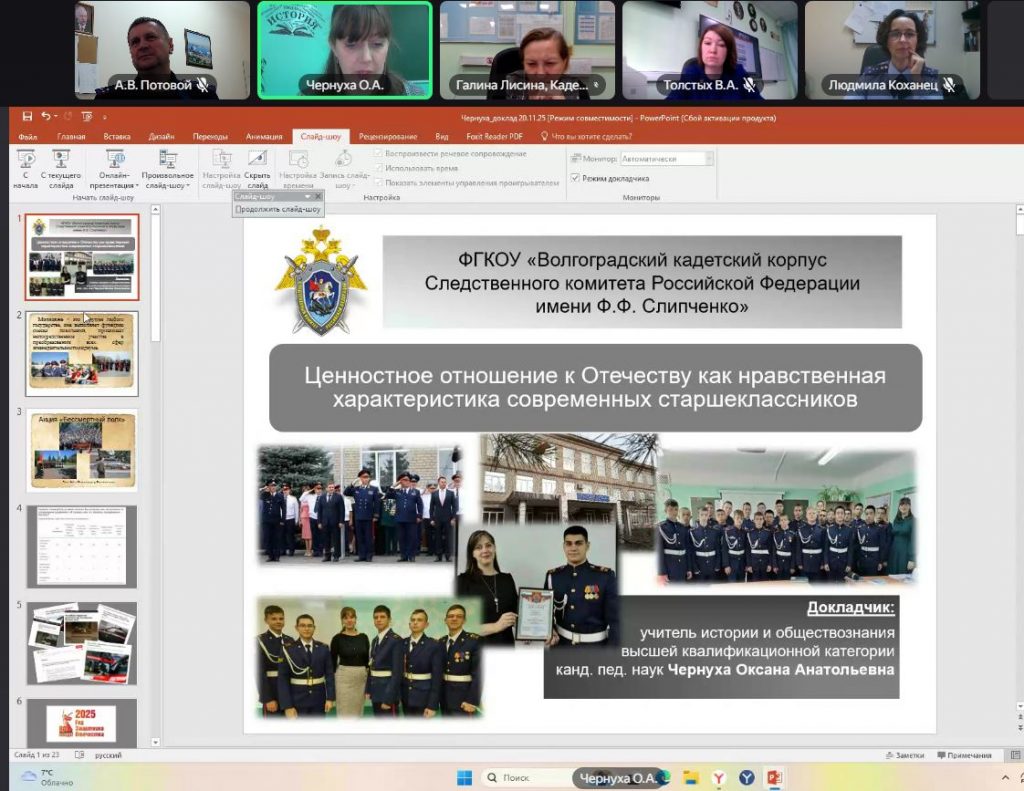 Учитель истории и обществознания учебно-методического отдела ФГКОУ «Волгоградский кадетский корпус Следственного комитета Российской Федерации имени Ф.Ф. Слипченко», кандидат педагогических наук Оксана Анатольевна Чернуха представила доклад на тему «Ценностное отношение к Отечеству как нравственная характеристика современных старшеклассников».