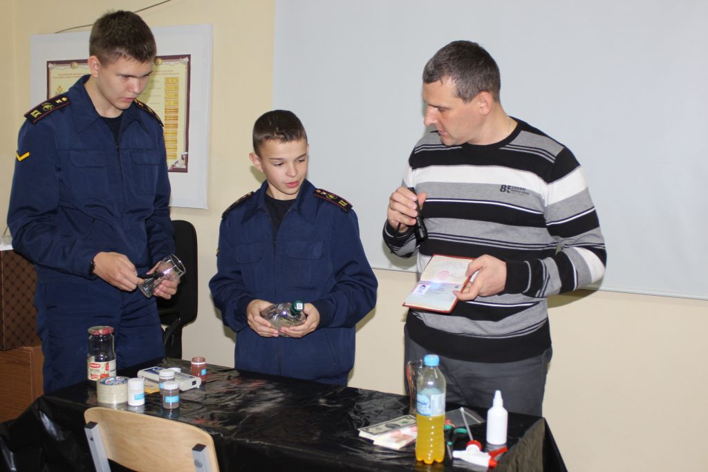 Во время мастер-классов кадеты пробовали самостоятельно выявлять следы рук на различных поверхностях, использовать люминисцентные средства для оставления скрытых меток на денежных купюрах и ультрафиолетовый осветитель для их выявления и проверки документов на подлинность, а также учились проводить экспресс-анализ биологических следов.