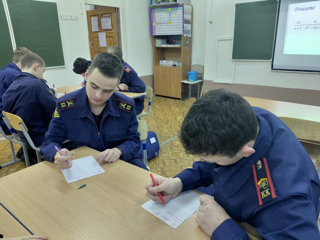 На «Марафоне математических знаний» с учителем математики высшей квалификационной категории Ириной Валентиновной Семейкиной команды девятиклассников восстанавливали в памяти свои знания из прошлых школьных лет, решали задачки на построение и пространственное мышление, угадывали связанные с математикой слова и вспоминали имена известных математиков. Старания команд привели к следующим результатам: 1 место заняли кадеты 9 «В» класса, 2 место – кадеты 9 «А» класса, 3 место – кадеты 9 «Б» класса.